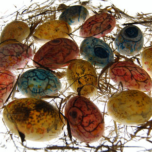 This series of work is a representation of “living” art within the subject matter of incubating eggs and was created as an assignment in the Drawing IV class at the University of South Dakota. Tasha used real eggshells with this series and presented them on a light table. She created five, harmonious color combinations paired with nest materials. The additive process onto the eggshells involved layering and sealing the surface. With the drawing, she utilized certain motifs to signify healthy, rotten, or unfertilized eggs. Watercolor paint, marker, and pen were used to decorate the surface of the shell. Nest Eggs was created to express the beauty and intimateness of a variety of nests and the candling of eggs.
